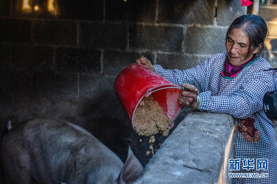 Li Fashun’s mother, Li Mingjiu, feeds pigs in the backyard in the Wa village of Mola, Zhongzhai, three village, Qingshui Township, Tengchong City (photo taken on January 19). Xinhua News Agency reporter Hu Chao photo