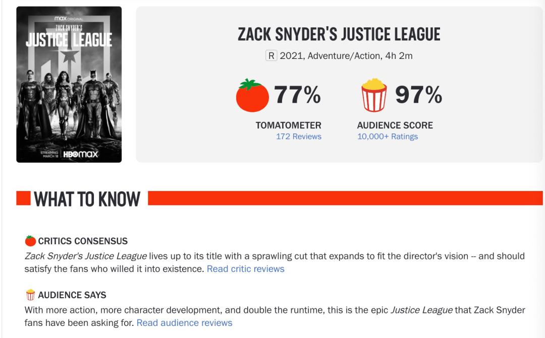 The much-watched "Zach Schneider’s Justice League" was launched on HBO Max on March 18th. The freshness of rotten tomato media was 77%, and the popcorn index of the audience was as high as 97%, setting a record for the director’s career.