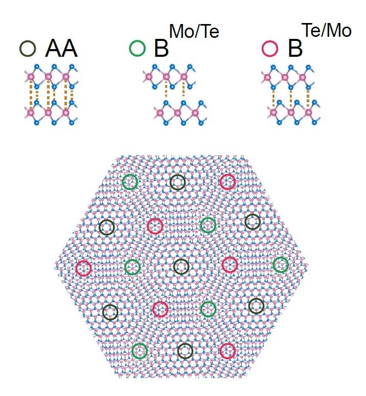 Schematic diagram of Mohr superlattice structure formed by two layers of MoTe2 corners, in which red atoms represent Mo and blue atoms represent Te. Three highly symmetrical stacking modes are represented by circles with different colors in the figure.