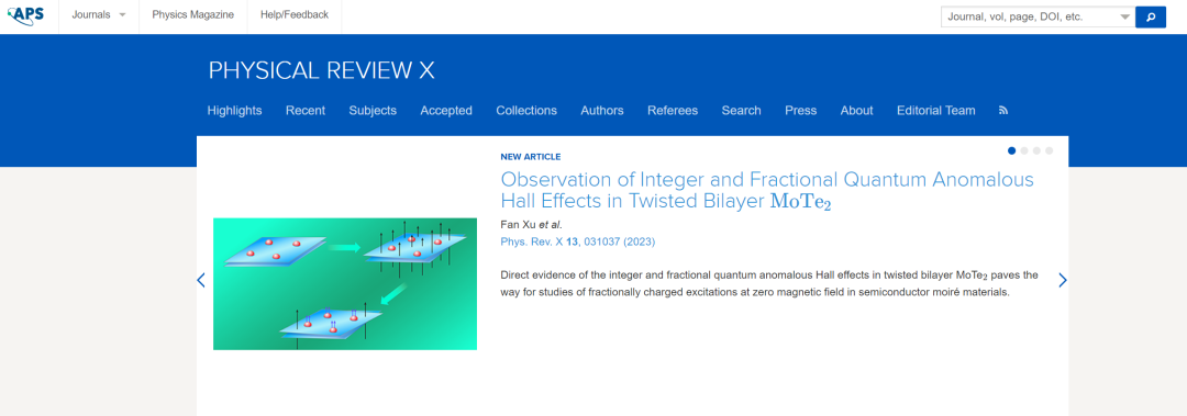 This work has been highly praised by the reviewers, which is considered as a breakthrough in the field, and the original new device preparation method paves the way for a series of subsequent studies around the fractional quantum anomalous Hall effect. This study opens the door to the study of novel physical properties such as fractional charge excitation and anyon statistics under the condition of zero magnetic field, and provides new possibilities and opportunities for topological quantum computing and other research. The paper was published in Physical Review X 13, 031037 (2023), and was recommended by the editor in the form of Featured in Physics. The review article "news &views" published by Nature holds that two research works provide a smoking-gun signature for the anomalous Hall effect of fractional quantum.